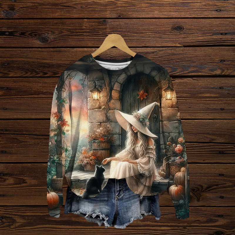 Halloween Beautiful Witch Kitten Print Oversized Casual Sweatshirt