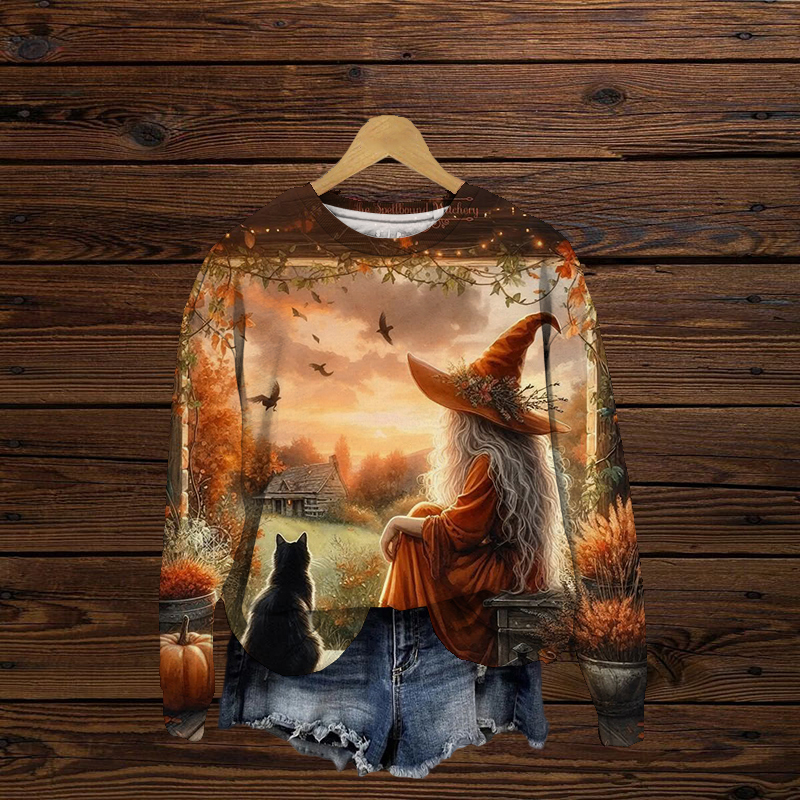 Halloween Beautiful Witch Kitten Print Oversized Casual Sweatshirt